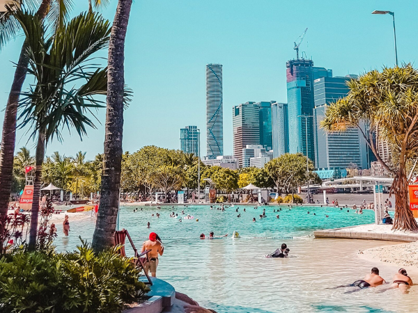 A palm-fringed inner-city swimming beach along a lagoon with a picnic area and snack stall.